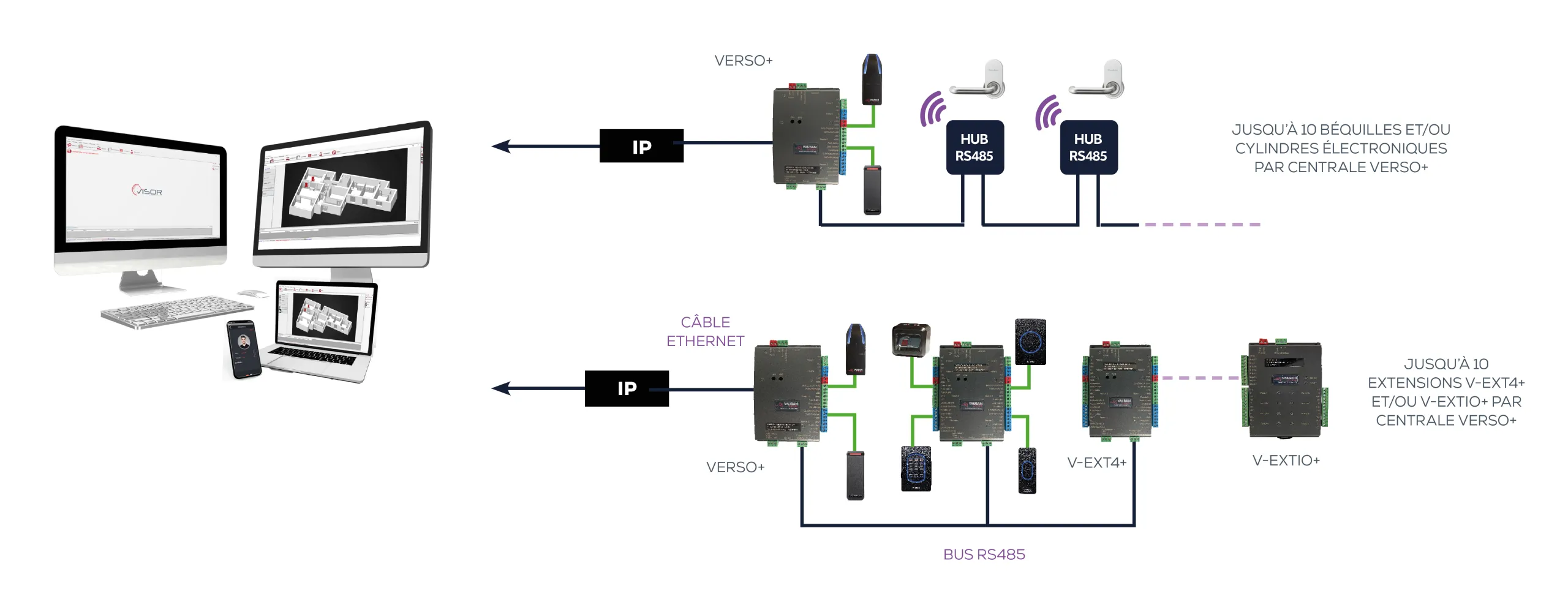 - Récupération et exploitation de vos matériels existants via les VERSO®+: possibilité d'intégrer les éléments d'une installation existante (câblage, lecteurs, badges)