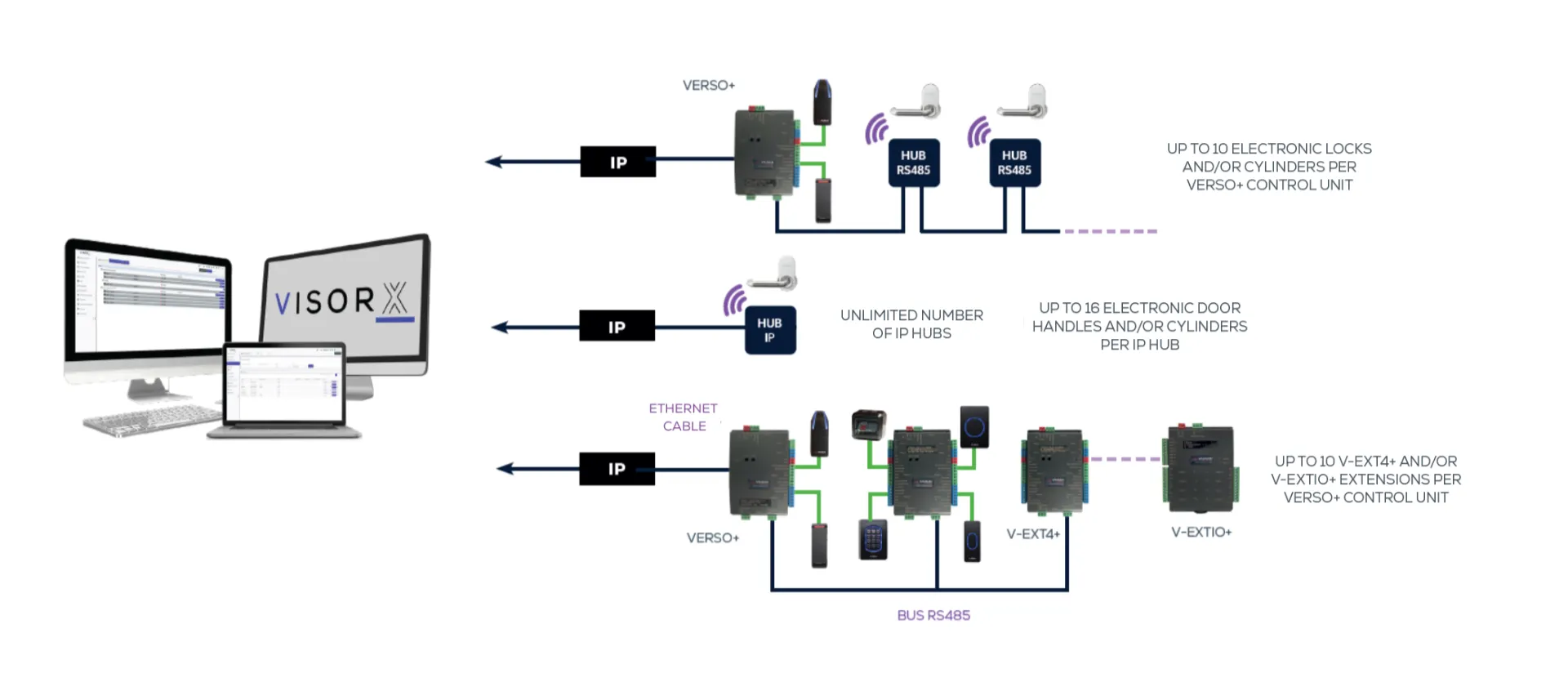 - Up to 10 V-EXT4+ and/or V-EXTIO extensions per VERSO+ central unit